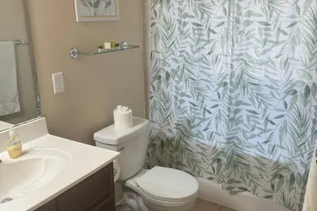 Down the hallway connected to the Great Room, you’ll find the “Blue Room” and the “Green Room”—names we labored over, as you can tell! Each room features a king-sized bed, private sliding doors opening onto the large deck, and stunning lake views. At the end of the hallway, there’s a full bathroom for shared convenience.