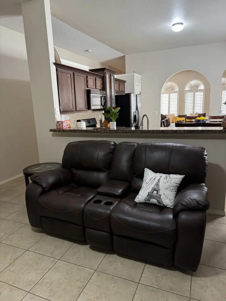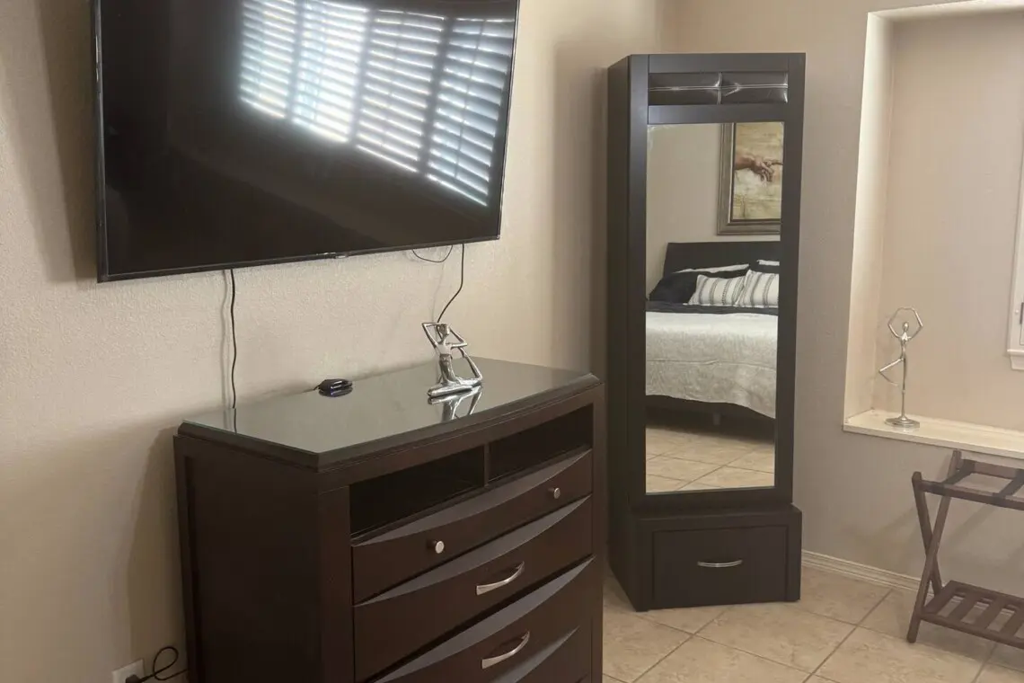 Another standout space branching from the Great Room is the “Outlaw Saloon.” This lively room comes equipped with a bar and a seating area facing two large flat-screen TVs. A convenient half bathroom is located just off the saloon. Wondering about the name? We’re glad you asked! One of the home’s owners has direct ties to the legendary Sundance Kid, while another traces their lineage back to a family member in Pancho Villa’s gang. Don’t worry, though—we’re all well-behaved here! The Outlaw Saloon is simply a place to channel your inner rebel and unwind in true Wild West fashion.