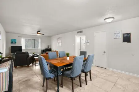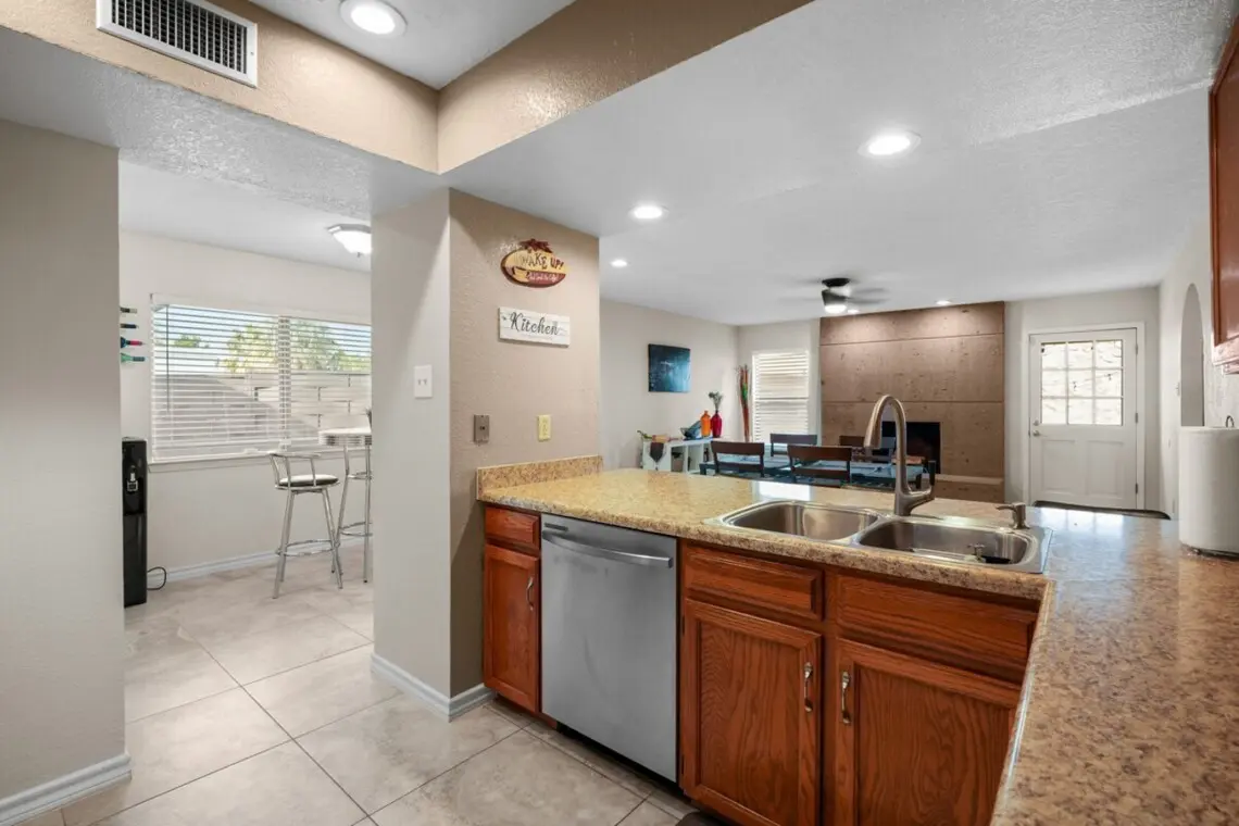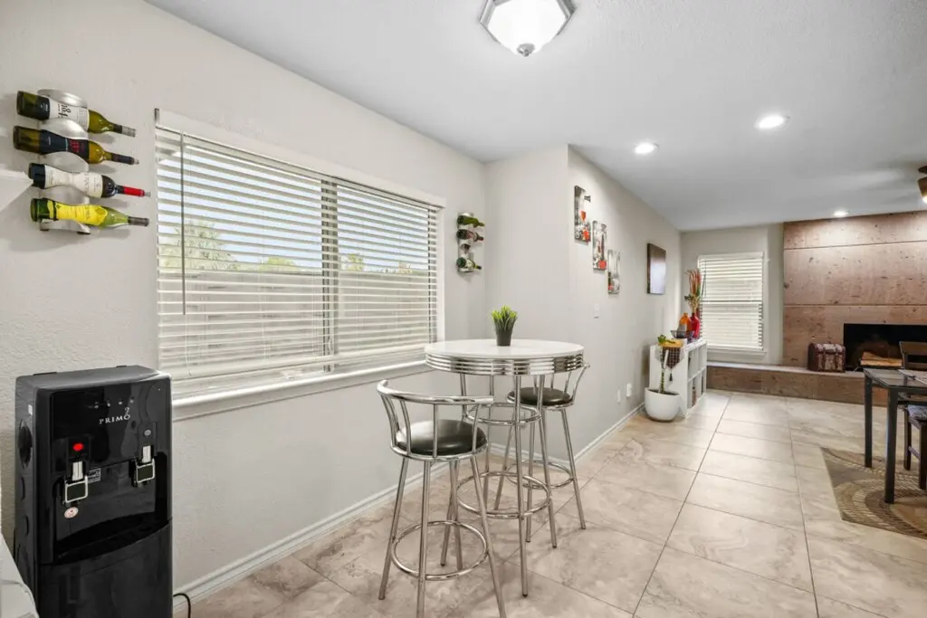 This spacious home has all you need with 2 primary suites, 2 guest bedrooms, and 3 bathrooms. There is no shortage of living space with a living room, 2 dining rooms, open floor plan w/fully-stocked kitchen, and onsite laundry. Enjoy your evenings outside underneath the comfortable patio in the turfed backyard-perfect for little ones to run around. This home is great for both long term guests or those coming in for a shorter stay with a large group. We look forward to hosting you!Neighborhood
